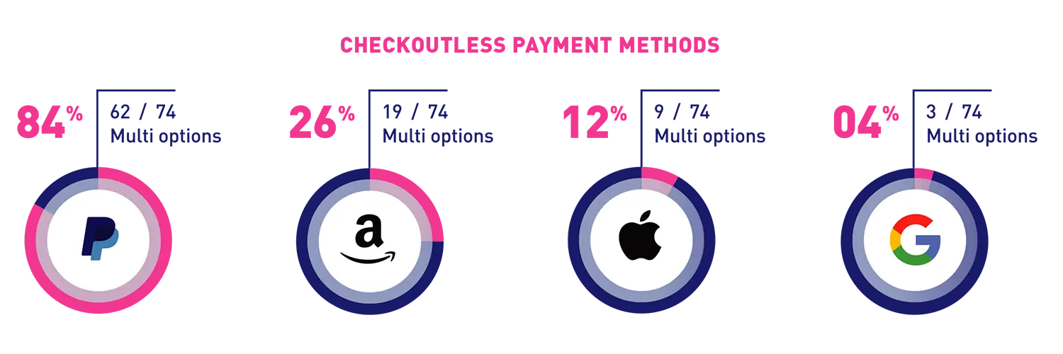 • Only 1 out of 250 retailers offered all four major wallets: PayPal, Amazon Pay, Apple Pay, and Google Pay.