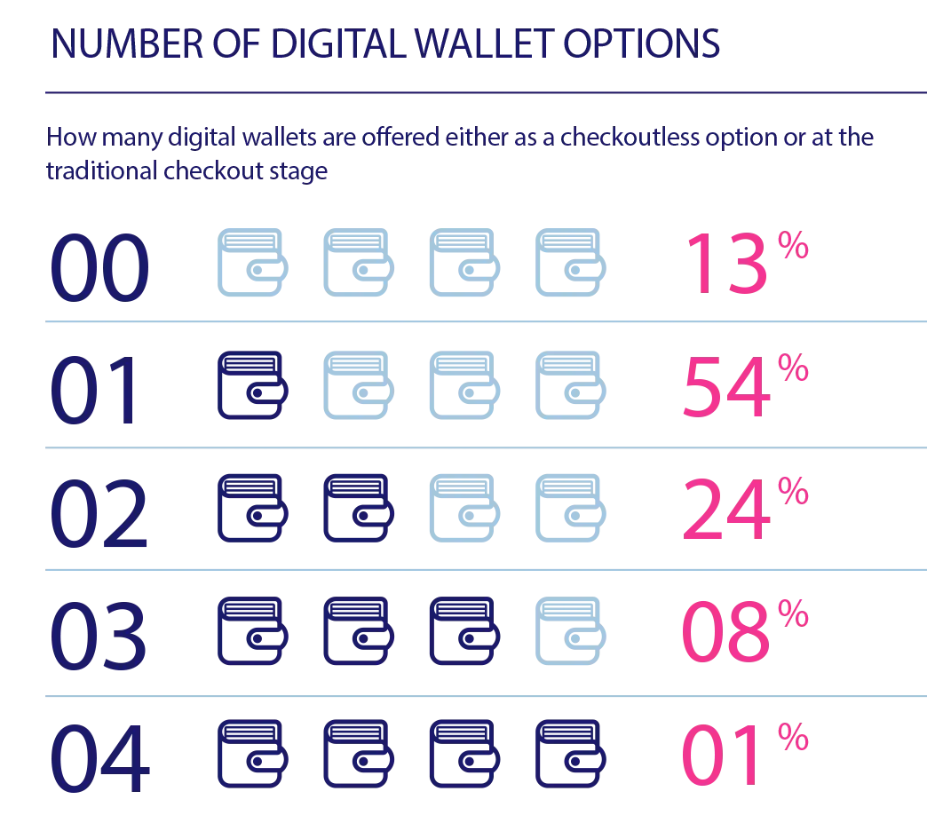 We also observed the number of digital wallets provided, either as a checkoutless option or at the traditional checkout stage. Over half the brands (54 percent) had just one wallet, while just under a quarter (24 percent) offered two. Only one retailer provided all four options, and 33 offered none.